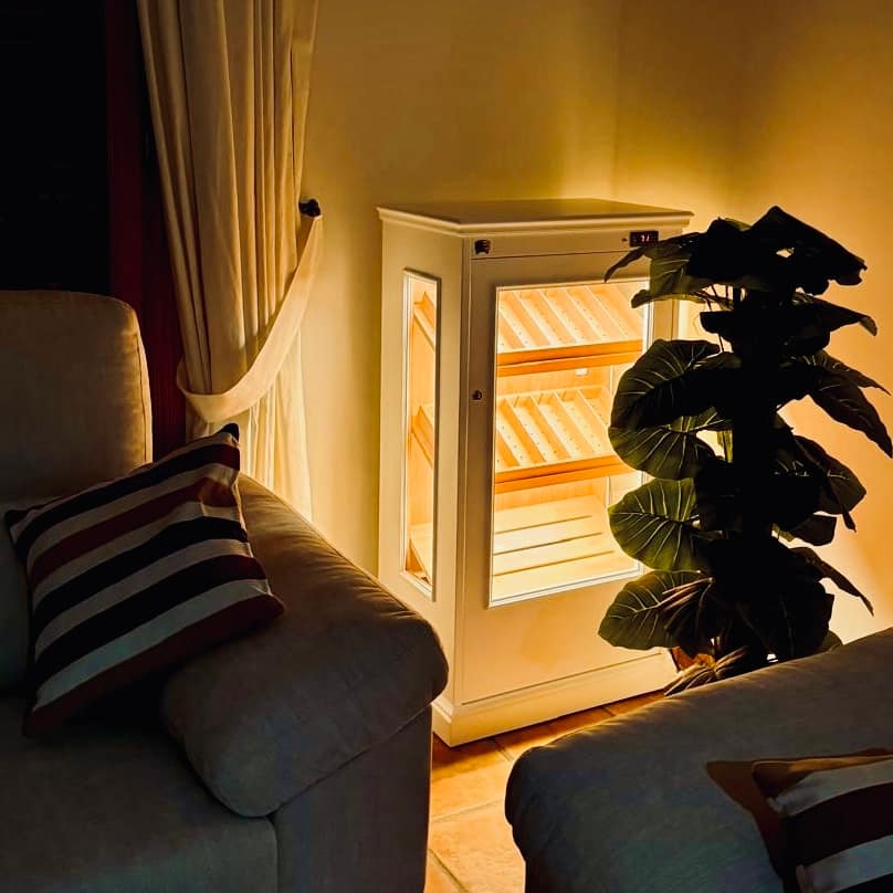This humidor, with a capacity for 40 boxes, is a modern classic, ideal for both cigar collectors and tobacco retailers. Made of solid wood, it features a cedar-lined interior with a shelf for box storage and a drawer with a tray for loose cigars. The exterior finish can be customized to the client’s preference. Humidification can be natural, using a tray and sponge, or electronic with the HR6 humidifier, which, through its nebulizer and fan system, ensures balanced humidity throughout the humidor. The analog hygrometer is fully calibratable.